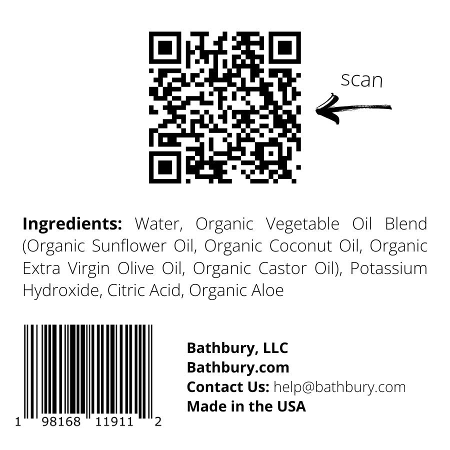 Ingredients: Water, Organic Vegetable Oil Blend (Organic Sunflower Oil, Organic Coconut Oil, Organic Extra Virgin Olive Oil, Organic Castor Oil), Potassium Hydroxide, Citric Acid, Organic Aloe.